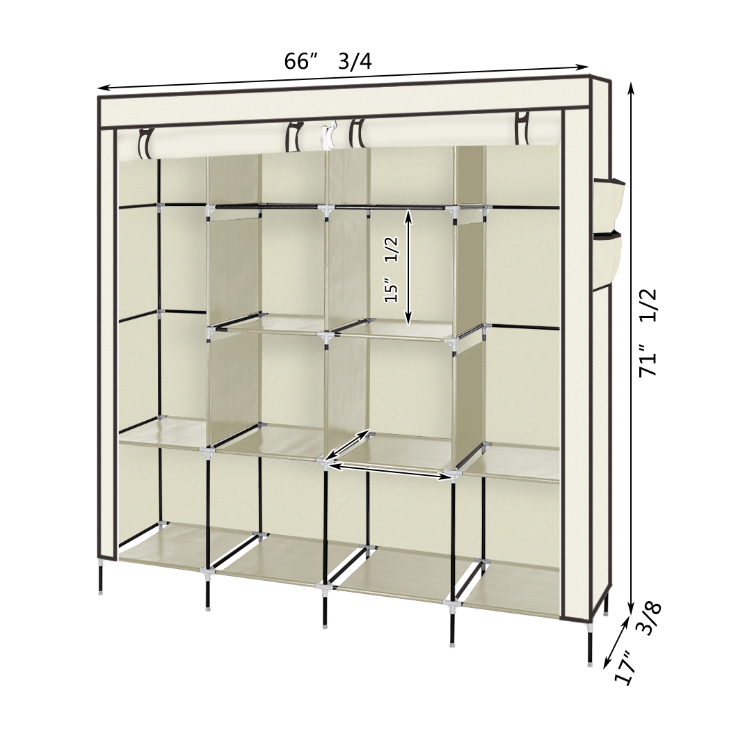 Our 67″ Portable Closet Storage Organizer Clothes Wardrobe is Made from Selected Non-Woven Fabric Cover, High Quality Steel Tube and PP Plastic Connectors, Which Will Durable and Meet Your Long Term Storage Needs. The Size for The Clothes Wardrobe Makes it Suitable for Organizing Your Small Rooms and Walk-In Closet. Movable Improved Clothes Hanging Rod and 12 Storage Shelves Offers You Enough Space Both for Your Longer Outfits and Folded Clothes. Zippered Dustproof Cover Offered to Keep Your Item Away from Dust and Water-Proof Fabric Tiers are Easy to Clean. It Will Be Great Convenient and Functional. Do Not Hesitate to Buy One!